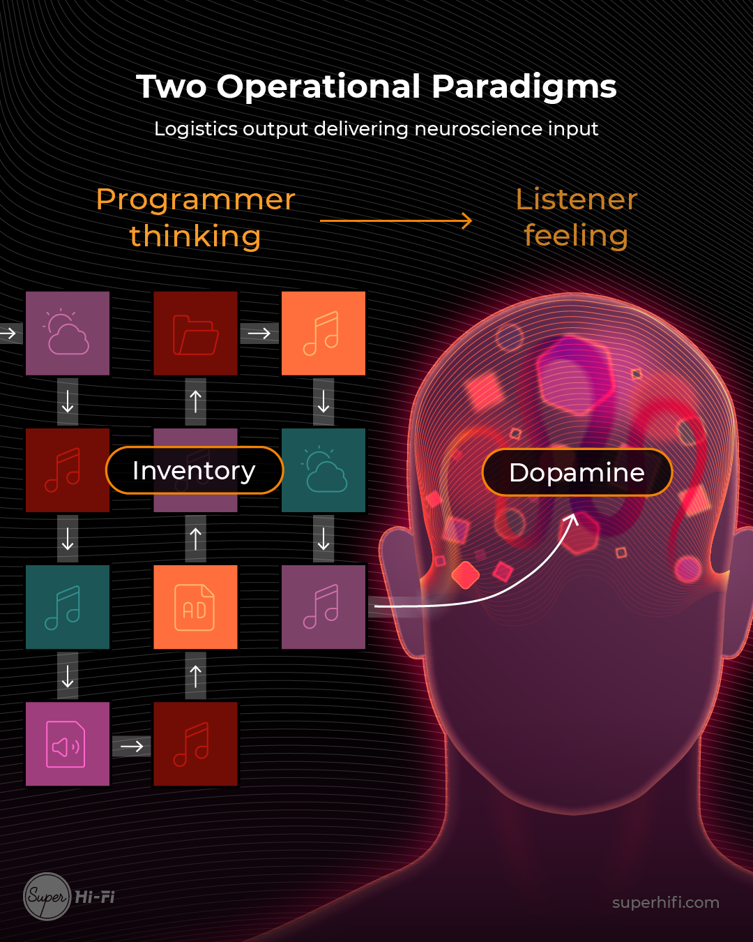This model is everywhere. All we’re doing here is applying the same skills, and the same science, to the radio experience. We’re working to craft a neural narrative that generates meaningful impact on the people that listen; we’re working to drive a dopamine response that leads to more listening.