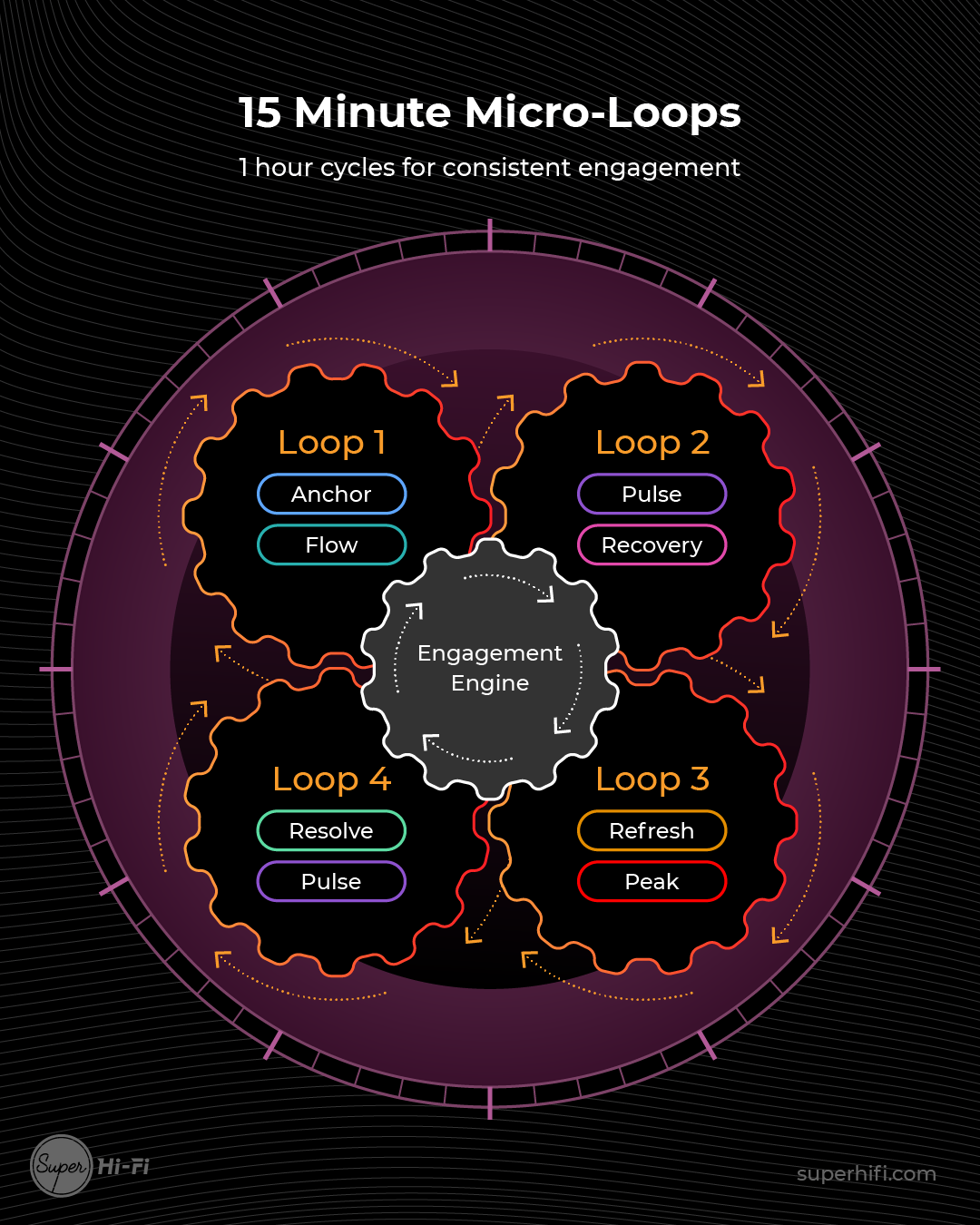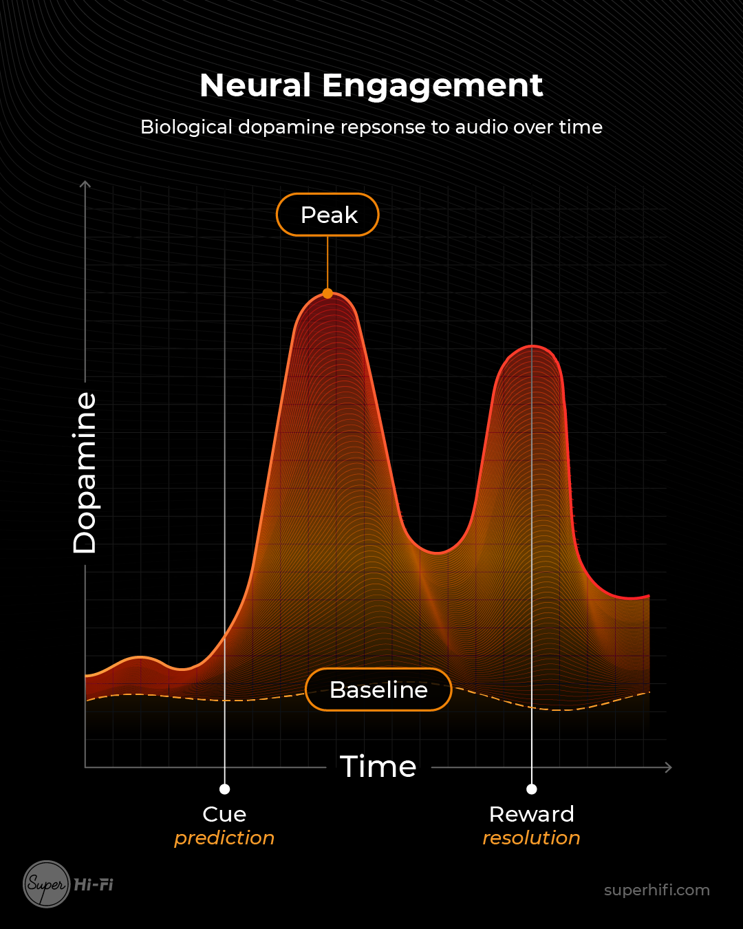 These 10-15 minute journeys are designed to ensure that no listener is ever too far away from a dopamine reward moment in their listening irrespective of when they joined the audio. Within each of these micro-loops, we’ll apply our Neural Economics approach, to ensure that we’re managing each listener’s neural state appropriately to drive more listening overall.