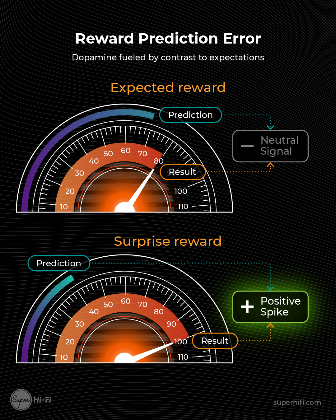 That’s because your brain doesn’t measure value in absolutes, it measures value in contrast to expectation. This is important, because if we want to set the highest dopamine to generate the highest satisfaction with our station listening experience, then we need to fully understand how to set up the right conditions for such a response.