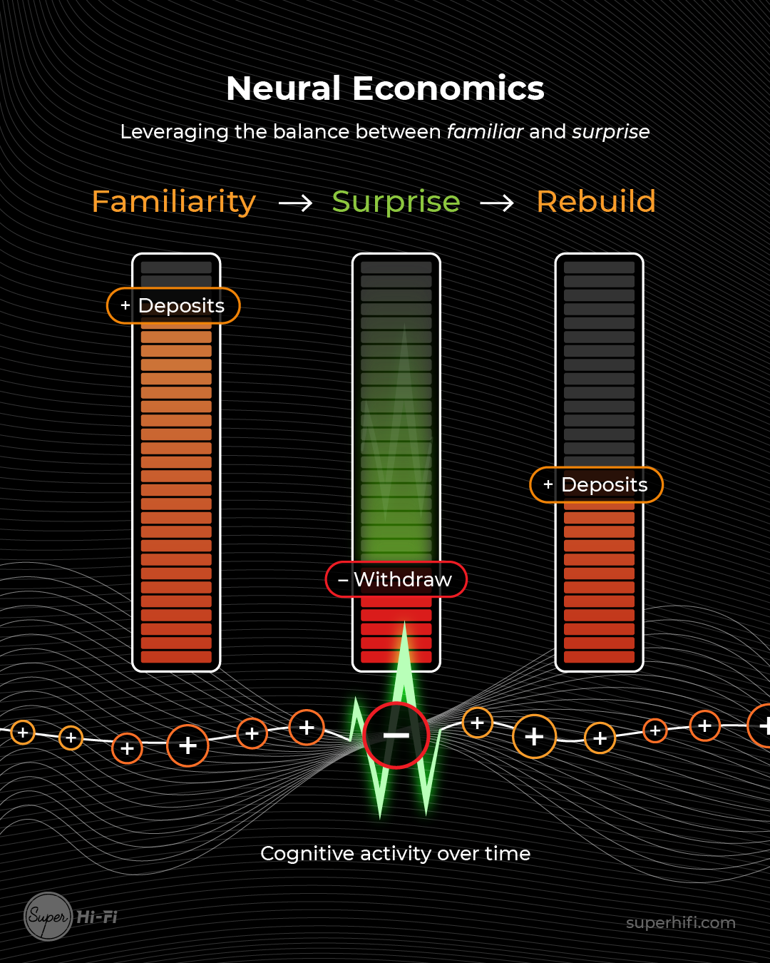 Let’s think about our listeners as a bank account, only instead of dollars what we’re budgeting for here is Cognitive Uncertainty. Remember, our listeners want that dopamine hit, and the way we give it to them is by balancing the ‘lows’ (Predictions) against the ‘highs’ (Resolutions) in a well managed formula. Our Cognitive Uncertainty Budget is how we optimize between those two ends of the spectrum, and our goal is to ensure that we’re hitting the mark. In economic terms, we’re looking to make the right moves in order to ensure the highest Return On Investment.
