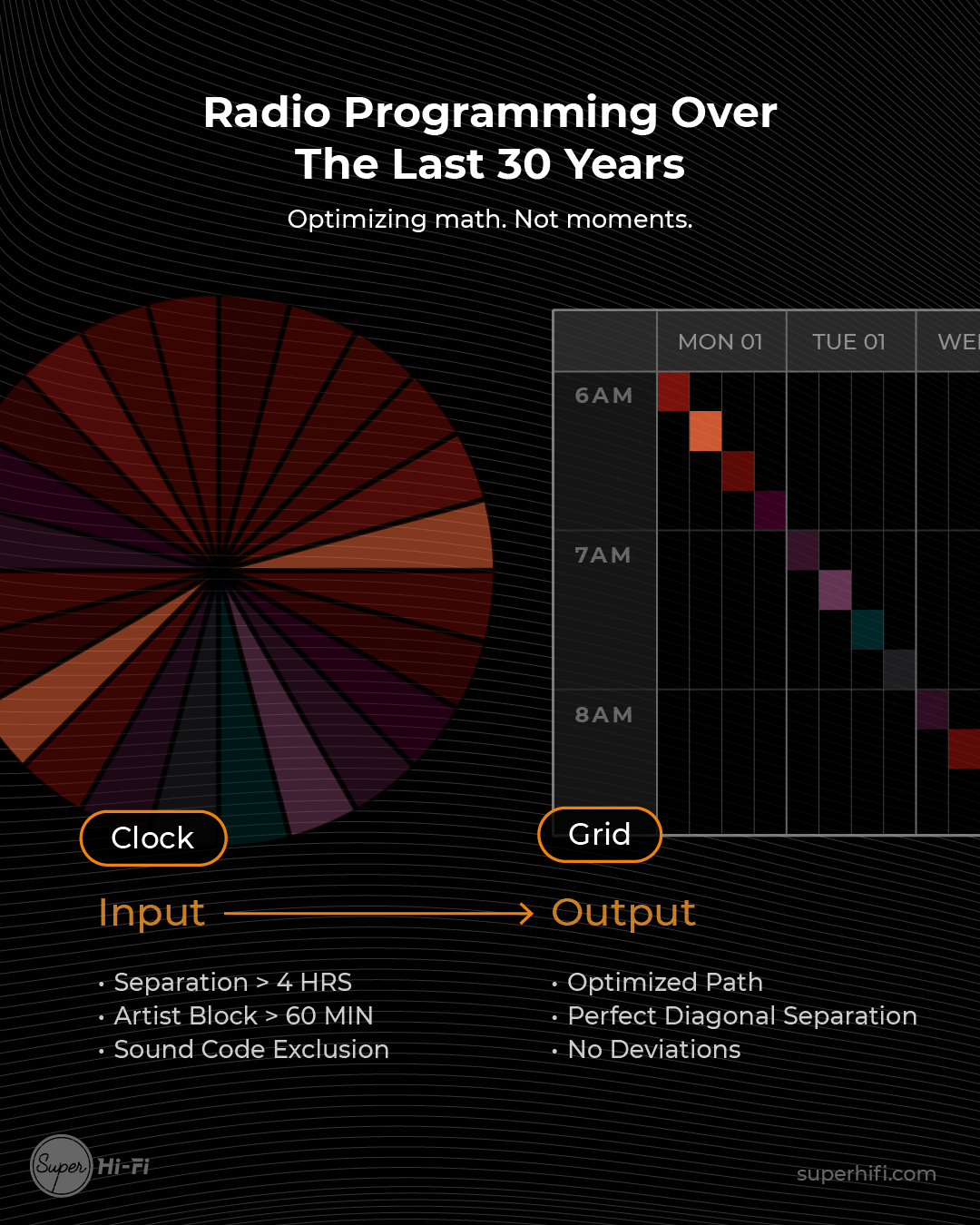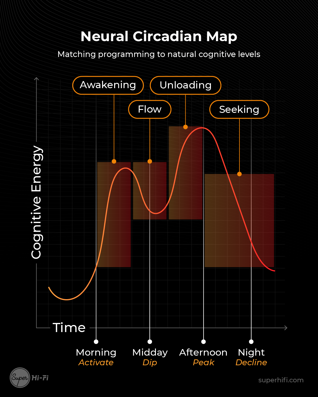 Finally, we have to be sensitive to dayparts, and align our clock grids to reflect how we naturally gravitate through State-changes over a circadian cycle. Each high-level daypart represents a specific neural default mode, and the suggested clocks are each designed to support the listening experience that the studies suggest would lead to the maximum time spent listening.